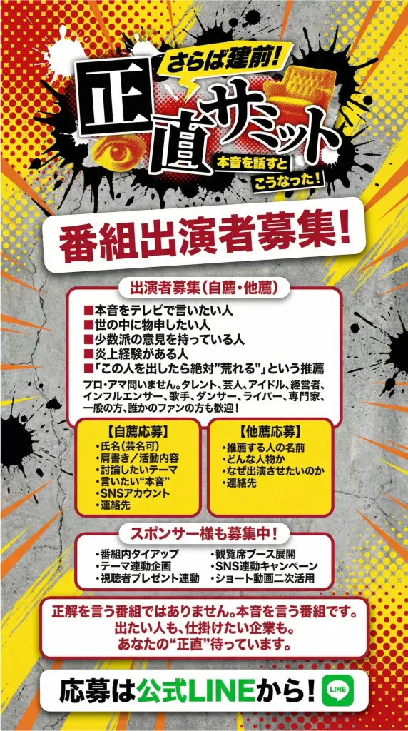 『正直サミット』は、そんな建前だらけの日常に風穴を開ける本音解放トーク番組。